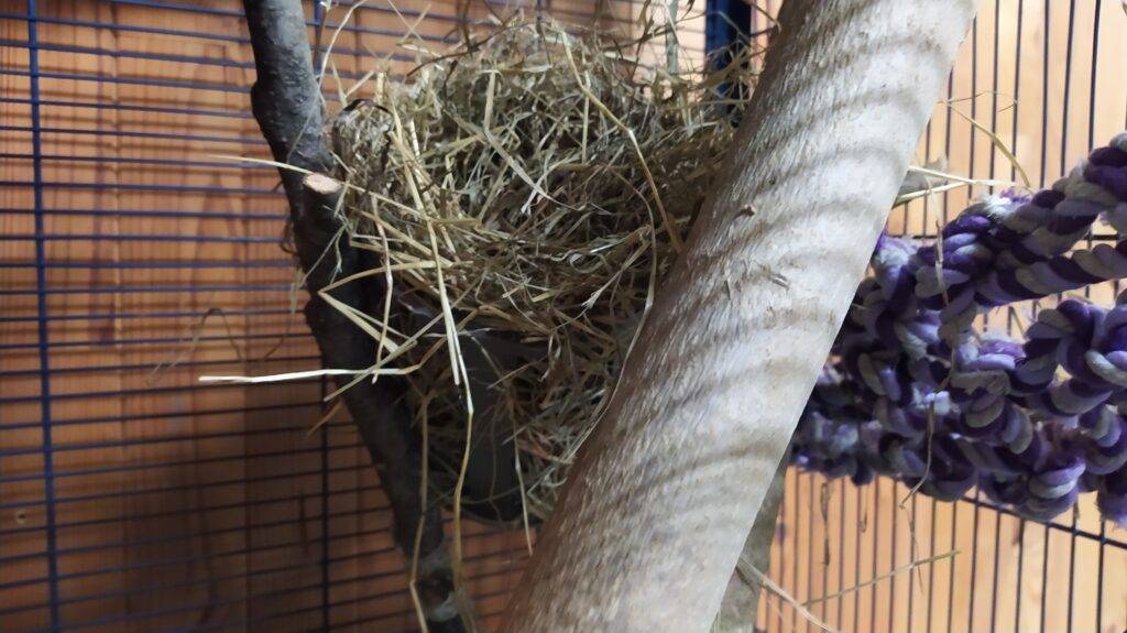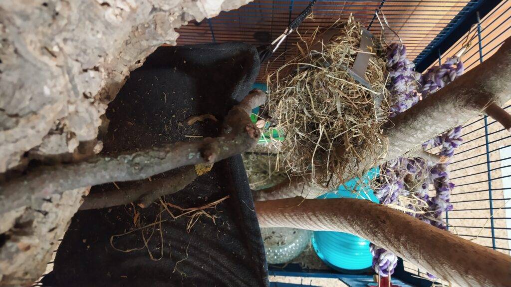 Avec l’arrivée du printemps, la possibilité de récupérer des éléments naturels pour proposer de nouveaux aménagements des cages. Tipi a gagné en espace, déménageant ainsi dans une volière entièrement aménagée pour lui tout seul.