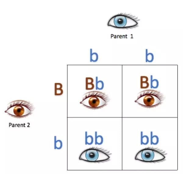 La couleur de l’iris humain illustre bien la dominance génétique : le gène brun est dominant (B), le bleu récessif (b). Un parent aux yeux bleus (bb) et un parent brun hétérozygote (Bb) donneront des enfants ayant 50% de chances d’avoir les yeux bleus et 50% bruns (hétérozygotes). Si le parent brun était homozygote (BB), tous les enfants auraient les yeux bruns.